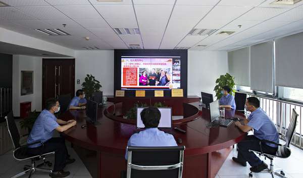 上午8时08分,主题活动以“迎七一,升国旗”仪式拉开序幕。仪式结束后,以集团多功能厅为主会场,视频会议室为分会场,各二级单位、项目部及京外单位通过网络会议系统同步收看参加了主题党课活动。